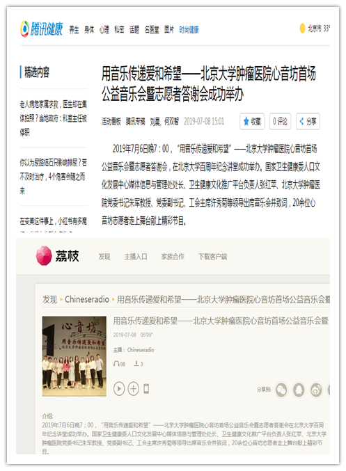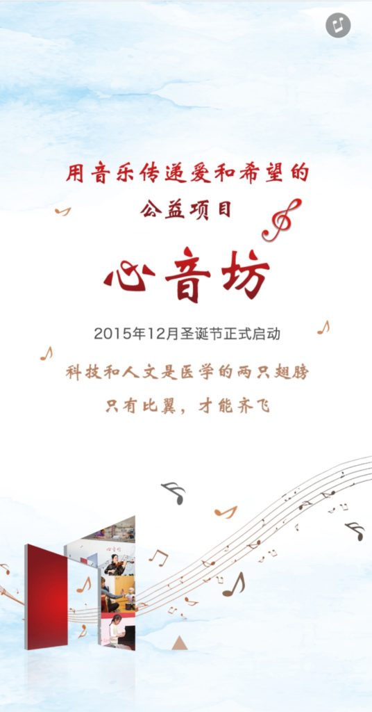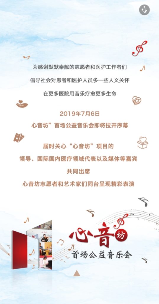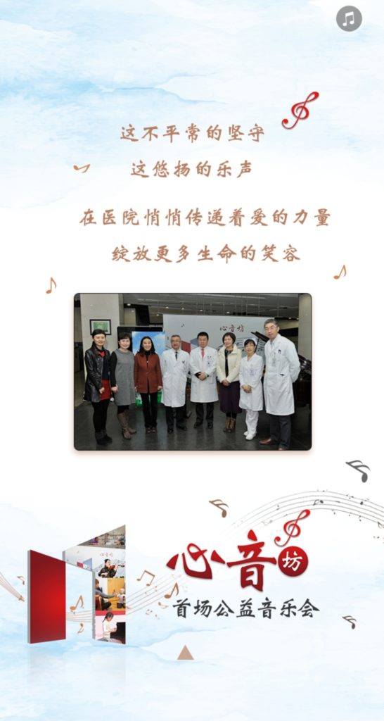 至此,心音坊——用音乐传递爱公益项目正式应运而生。以音乐艺术为载体,以医院为落地点,支持音乐艺术爱好者(包括癌症患者)为志愿者的队伍开展公益演出和公益活动,传递抵抗疾病的正能量,促进医患关系和谐的公益项目。