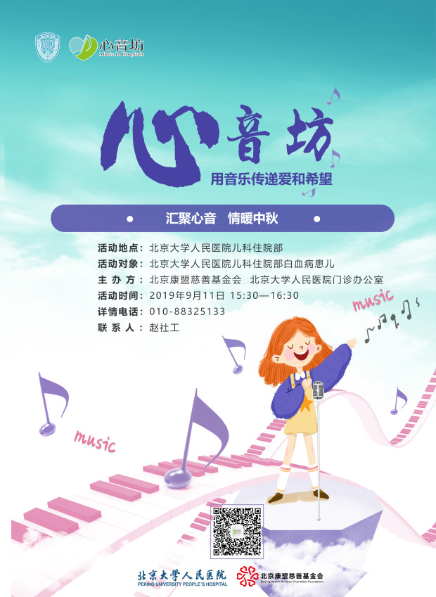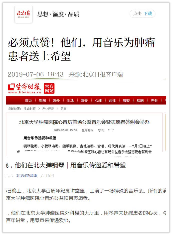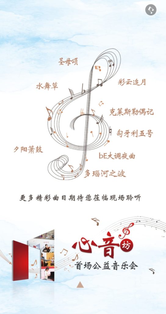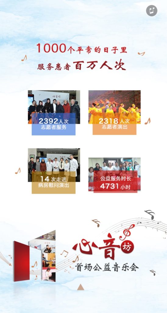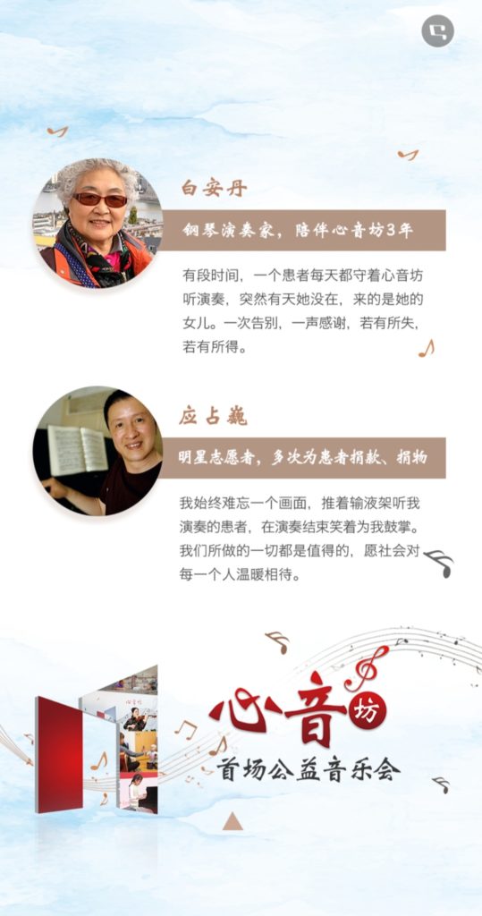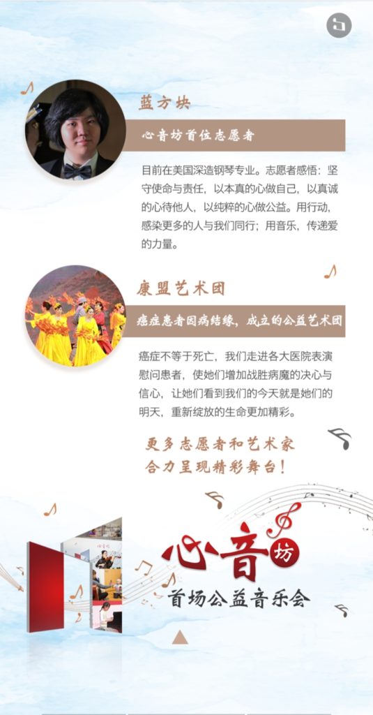 同时,将已经患有癌症、却热衷于艺术的患者们组成艺术团,资助他们到不同的医院去表演,与其他的患者朋友们进行交流; 从而推动患者间的互助,更好的完成项目使命。 在中文里,心——代表心灵;音——代表音乐、艺术;坊——代表一个大家庭,这个公益项目不是冰冷单调的。