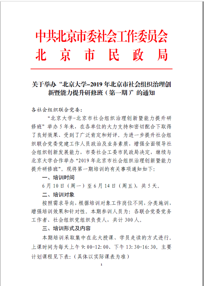关于举办“北京大学-2019年北京市社会组织治理创新暨能力提升研修班(第一期)”的通知