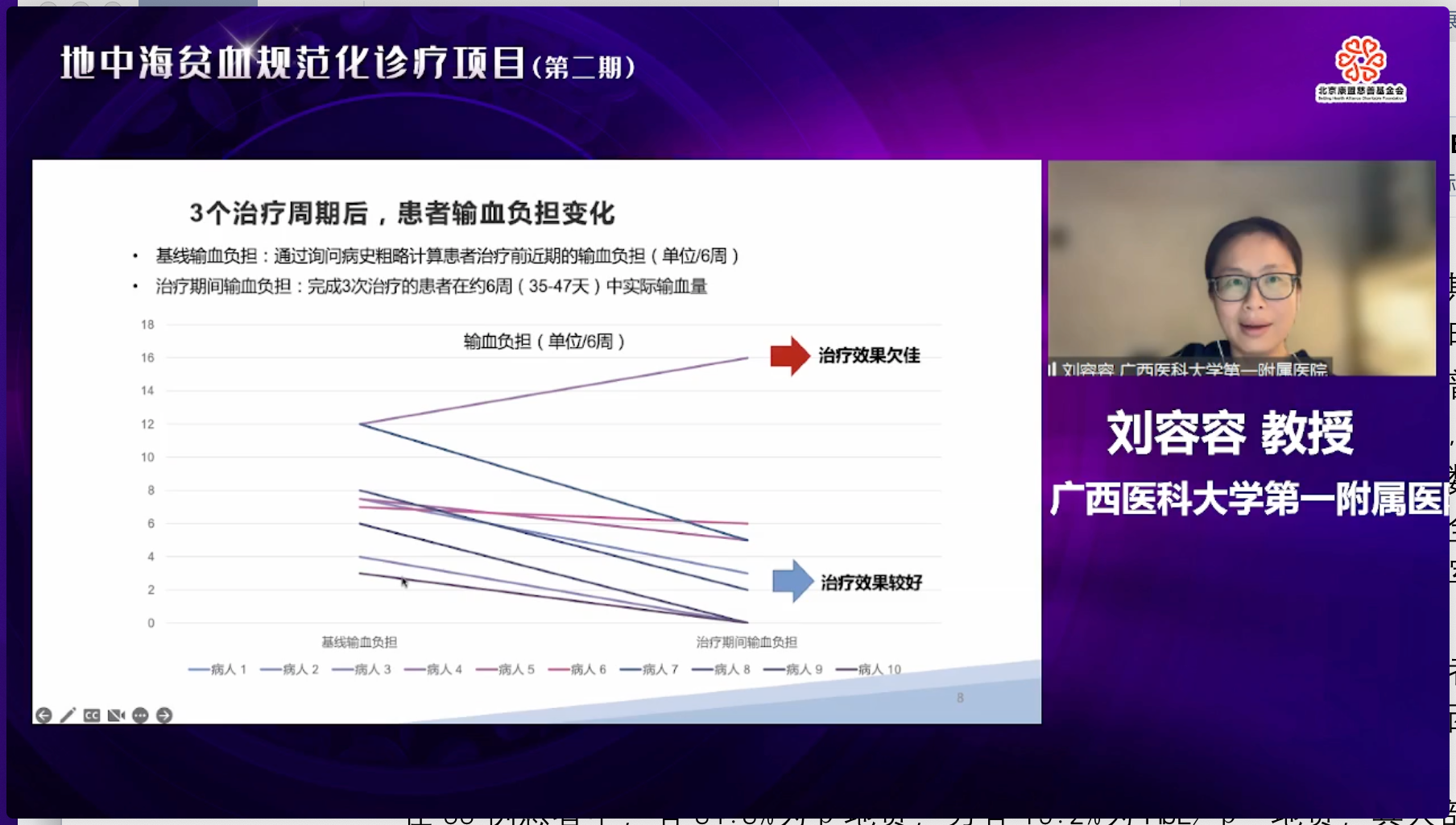 1017日进行的地中海贫血规范化诊疗项目∙第二期会议上,中山大学孙逸仙纪念医院方建培教授为本次会议致辞梅州市妇幼保健院廖燕霞教授表示地中海贫血是一组遗传性血液疾病,据2020年最新的中国地中海贫血蓝皮书调研报告显示,我国人群地贫基因携带率平均为8%,南方地区高发,其中广东地贫基因携带率为16.8%,广西地区地贫基因携带率为20% 。造血干细胞移植是目前唯一可根治的治疗手段,但是存在费用高昂、配型困难、年龄限制等挑战。对于无法接受干细胞移植治疗的重型β-地贫成年患者,其唯一维持生命的方法是终身规律输血+祛铁治疗。长期输血容易导致铁过载,过量的铁沉积在心脏、肝脏、胰腺等器官引起器官损伤甚至脏器功能衰竭我国铁超载现状十分严峻。许多输血依赖型β-地贫患者因为对铁过载危害认识不足、祛铁治疗不便等原因而难以依从祛铁治疗。目前,虽然我国政府主导建立了地贫防治体系,并且取得了可喜的阶段性成果,但是体系依旧不是十分完善。