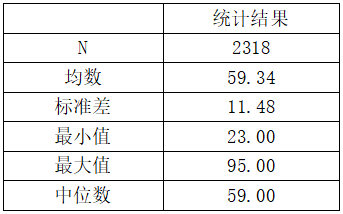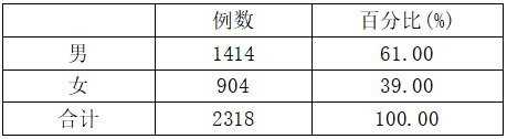 2318例肠癌临床数据中, 61.00%为男性,39.00%女性(2-1);年龄在23~95岁,平均年龄为59.34岁,主要集中在40~70岁(表2-2,图2-1),符合中国肠癌发病特征。