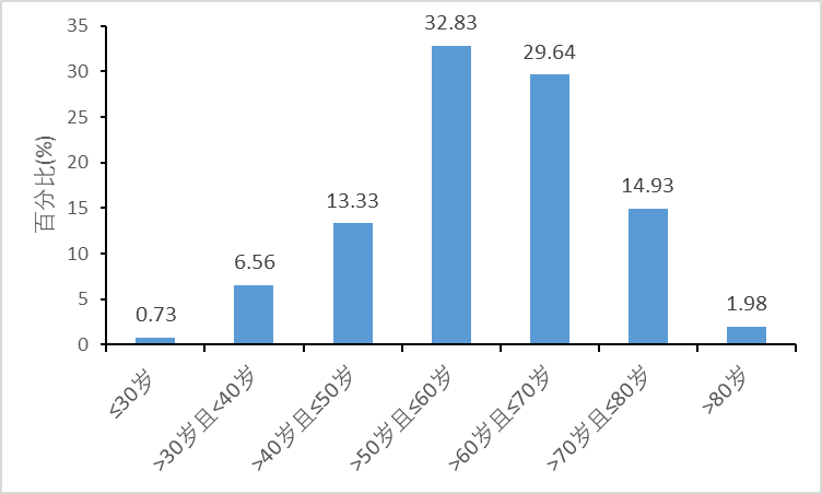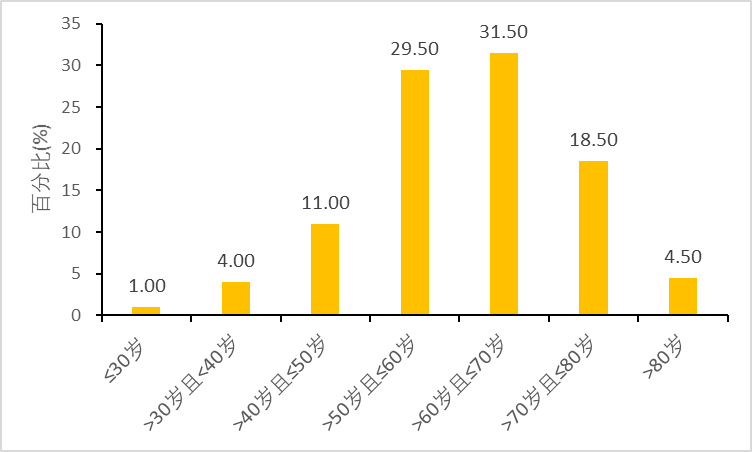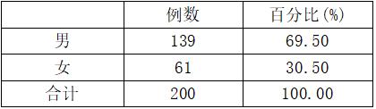 200例胃癌临床数据中,69.50%为男性,30.50%女性(2-3);年龄在25~86岁,平均年龄为61.36岁,主要集中在50~70岁(表2-4,图,2-5),男女比例及年龄分布与我国胃癌发病趋势相似。