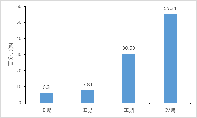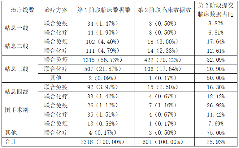 截止至数据统计日期,肠癌2318例临床数据中已有601例临床数据提交第2阶段数据(至少完成4~6个治疗周期),三线治疗临床数据占比较高,对该部分数据进行有效性分析结果显示:联合免疫方案298例,ORR为21.13%,DCR为94.96%;联合化疗方案64例,ORR为40.63%,DCR为96.88%(表4-1);对未提交第2阶段的1717例临床数据(至少完成2~3个治疗周期)进行有效性分析,其中三线治疗临床数据1212例,其有效性分析结果显示:联合免疫方案832例,ORR为88.34%,DCR为97.47%;联合化疗方案380例,ORR89.21%,DCR为96.84%(表4-2),因数据收集时间限制,截止到数据统计阶段仍有部分第1阶段临床数据未进入到第2阶段。