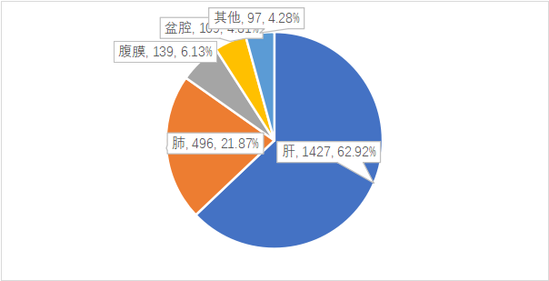 根据TNM分期,55.31%的临床数据诊断为Ⅳ期,30.59%诊断为Ⅲ期,Ⅰ期和Ⅱ期的临床数据较少(图2-2),临床数据普遍存在转移(97.84%),最常见转移部位为肝脏(占所有的转移部位的62.92%),其次为肺脏(21.87%),而后依次为腹膜、盆腔及其他(图2-3)。大部分临床数据有良好的体能状态,25.67%的临床数据ECOG评分0分,64.45%的临床数据ECOG评分为1分,8.63%临床数据ECOG评分为2分(图2-4)。