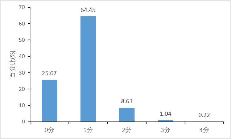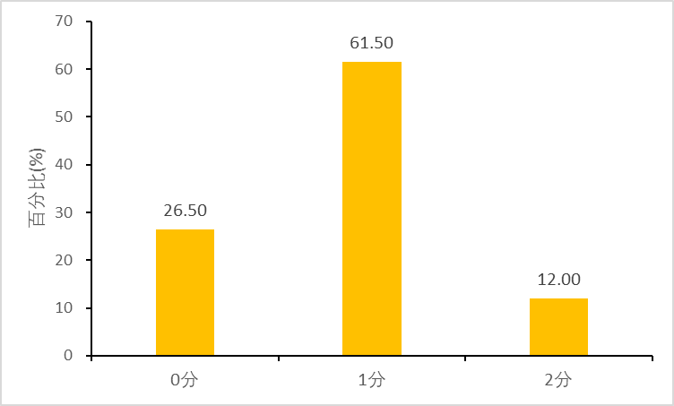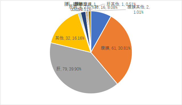 根据TNM分期,48.50%的临床数据诊断为Ⅳ期,26.50%诊断为Ⅲ期,19.50%诊断为Ⅱ期Ⅰ期临床数据较少(图2-6),临床数据普遍存在转移(99.00%),最常见转移部位为肝脏(占所有的转移部位的39.90%),其次为腹膜(30.81%),而后依次为肺及其他,极少数临床数据存在多部位转移(图2-7)。大部分临床数据有良好的体能状态,26.50%的临床数据ECOG评分0分,61.50%的临床数据ECOG评分为112.00%临床数据ECOG评分为2分(图2-8)。