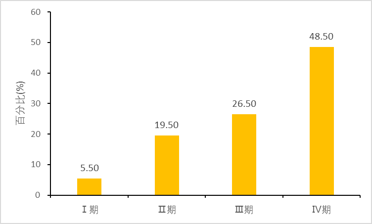 目前CSCO胃癌指南中将小分子抗血管生成药物推荐在晚期三线使用,在晚期一二线及围术期的探索正在进行中,如呋喹替尼和紫杉醇联合疗法二线治疗胃癌的Ib/II期结果显示7],其客观缓解率(ORR)为25.9%,疾病控制率(DCR)为66.7%,中位生存期为8.5个月,中位无进展生存期为4.0个月。呋喹替尼与紫杉醇联合疗法治疗晚期胃癌或胃食管结合部(GEJ)腺癌Ⅲ期临床研究初步结果显示,无进展生存期取得具有统计学意义的显著改善,客观缓解率(ORR)、疾病控制率(DCR)和延长缓解持续时间(DOR)在内的次要终点亦均观察到具有统计学意义的显著改善。本项目征集200例晚期胃癌临床数据,临床数据普遍存在转移(99.00%),最常见转移部位为肝脏(占所有的转移部位的39.90%),其次为腹膜(30.81%)。Ⅲ期、Ⅳ期患者占比分别为26.50%、48.50%;大部分临床数据有良好的体能状态,88%的临床数据ECOG评分≤1分。小分子抗血管生产药物较多用于二线治疗(51.5%),其次三线治疗(31.00%)和一线治疗(12.5%)。常见治疗方案中单药治疗(42%),其次是联合化疗(30%)和联合免疫治疗(28%)。截止数据收集时间观察胃癌临床数据疗效评估结果,二线治疗临床数据(103例,占总临床数据数51.5%)中约36.89%提交完整3个阶段数据(38例,治疗至少3~4个周期),该数据有效性分析显示:单药治疗方案24例,ORR为29.17%,DCR为100.00%;联合免疫方案9例,ORR为22.22%,DCR88.89%;联合化疗方案5例,ORR为60%DCR为100%;但由于样本量有限,待更多数据收集完成后做进一步分析。