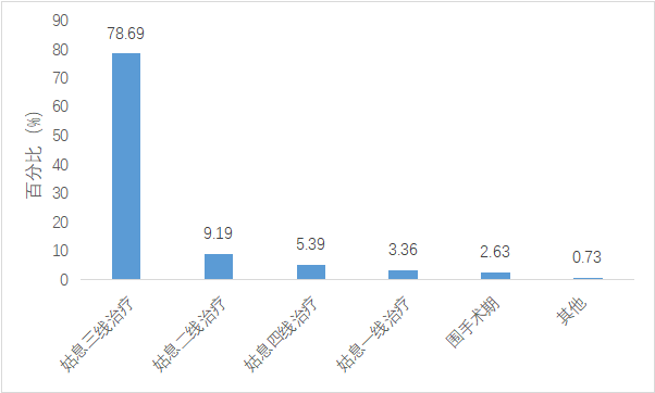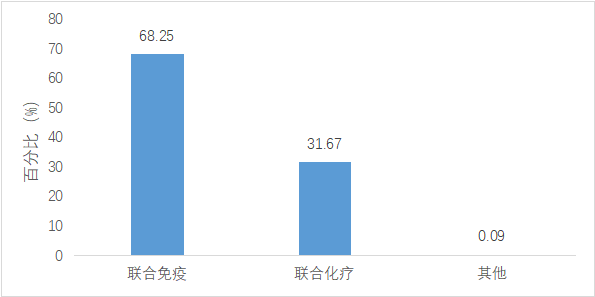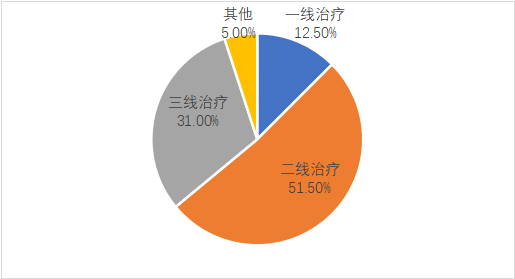 比较肠癌临床数据小分子TKI各治疗线数治疗周期及治疗方案情况,姑息三线联合免疫治疗方案最多,占比为56.73%,且提交第2阶段比例占比为32.09%(表3-1)