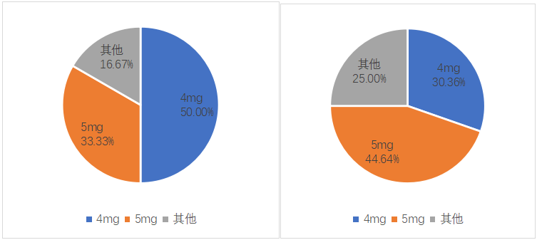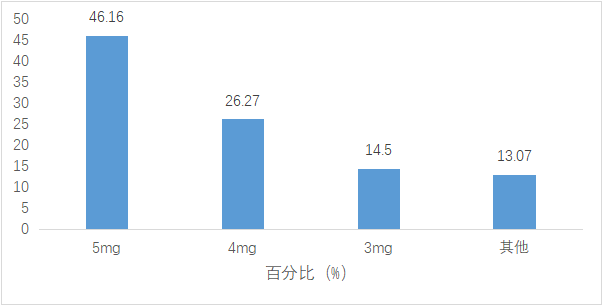 2318例肠癌临床数据完成第1阶段治疗,使用小分子抗血管生成药物治疗的三线治疗为主占78.69%,其次为二线占9.19%,四线占5.39%(图3-1),小分子抗血管生成药物治疗方案中以联合免疫治疗最多占68.25%,其次为联合化疗占31.67%,极少数联合其他治疗(图3-2);联合免疫治疗方案中最常见药物为信迪利单抗80.03%(图3-3));小分子抗血管生成药物给药方案,最常用剂量为最常用治疗方案为5mg每天,用2周停1周,3周为一个治疗周期,占比46.16%;其后依次为4mg治疗方案占26.27%,3mg治疗方案占14.5%,其他剂量13.70%(图3-4)。