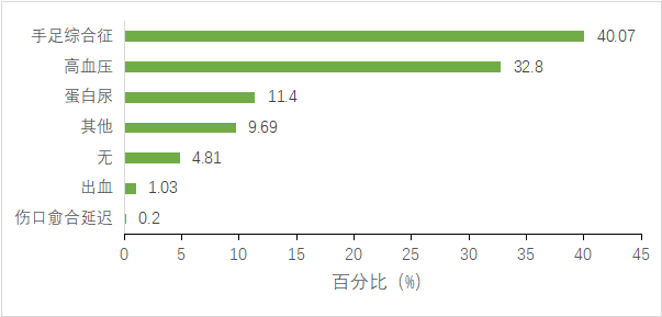 2518例肠癌和胃癌患者中,不良反应发生率为95.19%,最常见的不良反应为手足综合征(40.07%),其次为高血压(32.8%),蛋白尿(11.4%),出血(1.03%),发生率低于1%的不良反应为伤口愈合延迟(0.2%),其他不良反应(9.69%)(图4-1)。
