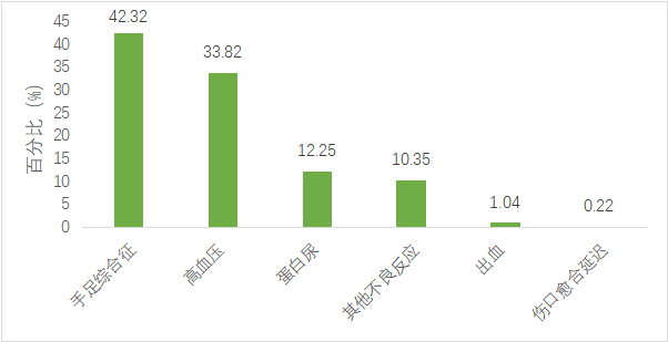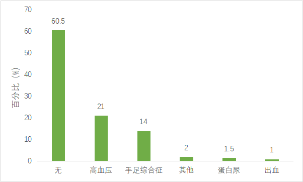 胃癌临床数据不良反应率为39.5%,常见的为高血压和手足综合征,其余的不良反应发生率都较低,如蛋白尿、出血(图4-4)。