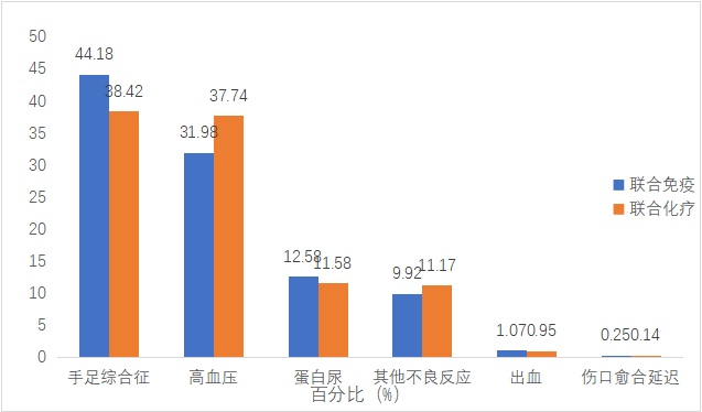 各不良反应在两小分子TKI使用方案(联合免疫和联合化疗)中发生率均较接近,两治疗方案中较常见的仍为手足综合征(44.18%,38.42%)和高血压(31.98%,37.74%),随后为蛋白尿,而出血和伤口愈合延迟的发生率均低(图4-3)。