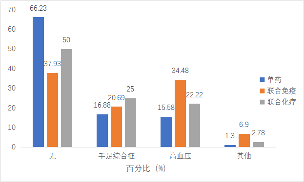 95.19%的临床数据报告不良反应,所有临床数据在治疗周期内未出现因无法耐受严重不良反应而提前结束治疗。最常见(发生率≥20%)的不良反应为手足综合征(40.7%)、高血压(32.80%),各不良反应在联合免疫和联合化疗方案中发生率均较接近,单药治疗方案不良反应发生率较低,为33.77%。没有严重不良反应出现,安全性可控。