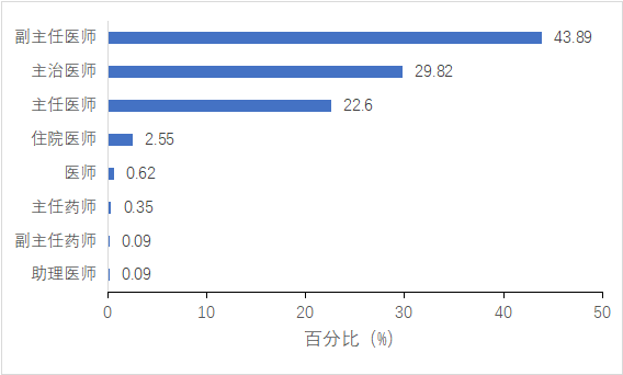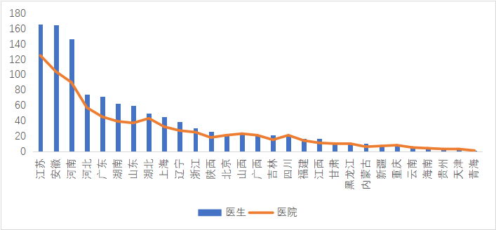全国有29个省份(省、自治区、直辖市)175个城市825家医院的1137位医生参加该项目,副主任医师职称以上占比66.49%(图5-1),医生及医院数量较多的省份为江苏、安徽、河南、河北、广东(图5-2)。
