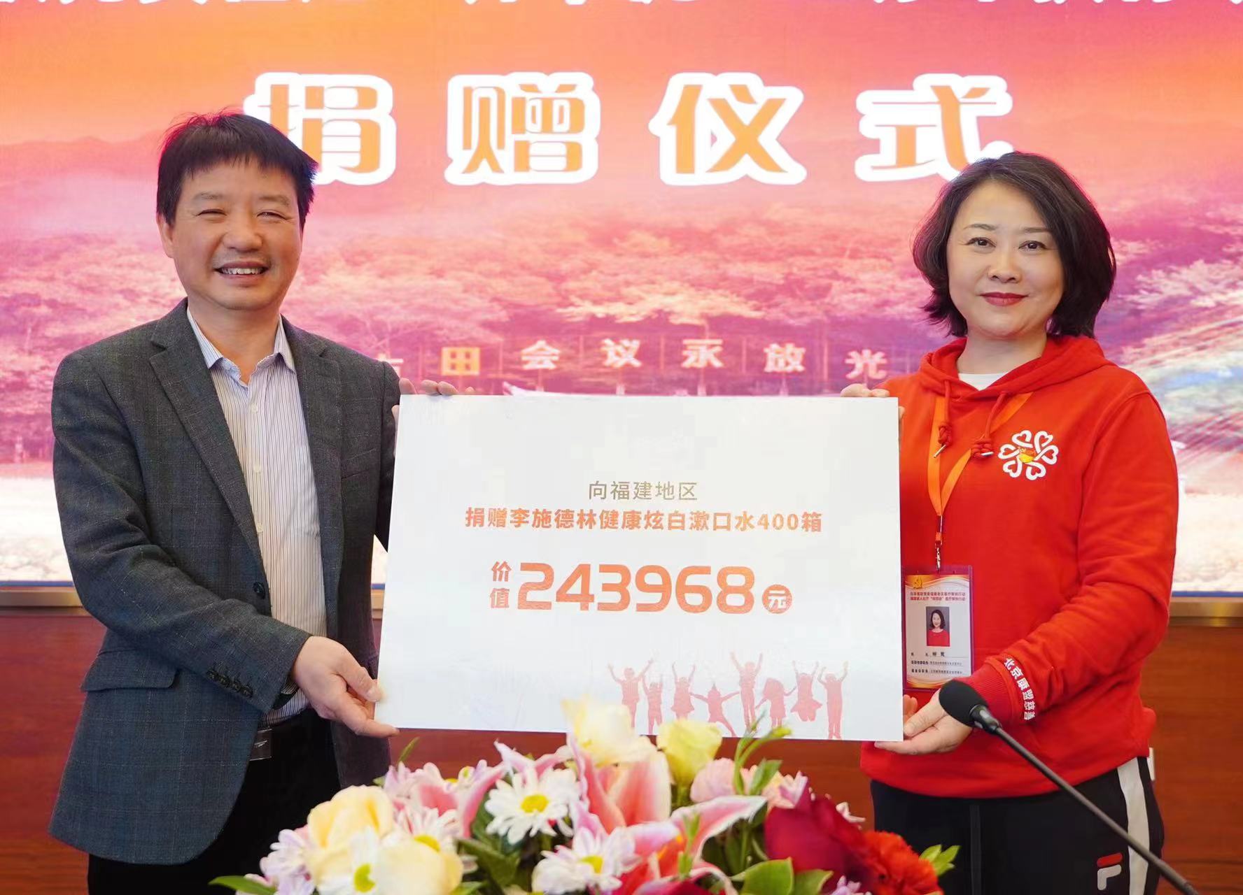 (北京康盟慈善基金会理事长柳莺代表北京康盟慈善基金会向福建地区捐赠价值24.3968万元的漱口水)
