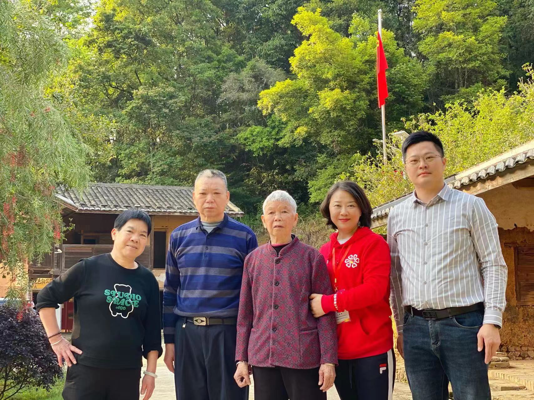 (北京康盟慈善基金会理事长柳莺与伯公凹七烈士之一邹端仁的儿媳吴球英(左3)、烈士之孙邹勉贤(左2)、孙媳妇苏建联(左1)、曾孙邹广敦(左5)合影留念)