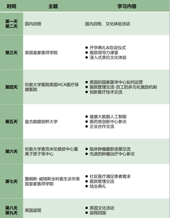 线下课程包括九天八晚的英国皇家医学交流,带领中国的医务工作者们走进英国皇家医师学院,伦敦大学学院麦克米伦癌症中心、UCLH重离子质子束中心,伦敦大学医院,英国HCA医疗保健医院,剑桥大学,詹姆斯-威格斯全科医生诊所等英国顶级医疗科研机构,实地交流学习。具体安排如下: