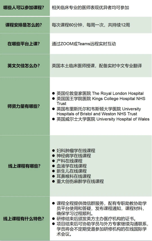线上课程则将通过线上会议平台直播,每五位中国医务工作者组成一组,就某一临床话题邀请英国国家医疗服务体系NHS顶级医疗机构的专家进行授课。让学员了解目前国际上医学领域的新技术、新理念的同时,彼此研讨切磋,从而提升其临床技能与团队合作水平,培育临床实用人才。